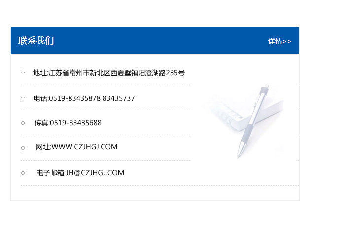 地址:常州市新北區友邦商務大廈1幢16、17層  電話:0519-85101652  傳真:0519-85112595  郵編:213022  網址:www_cz-jiayue_cn.veersun.com  郵箱:xiajifengaa@163.com